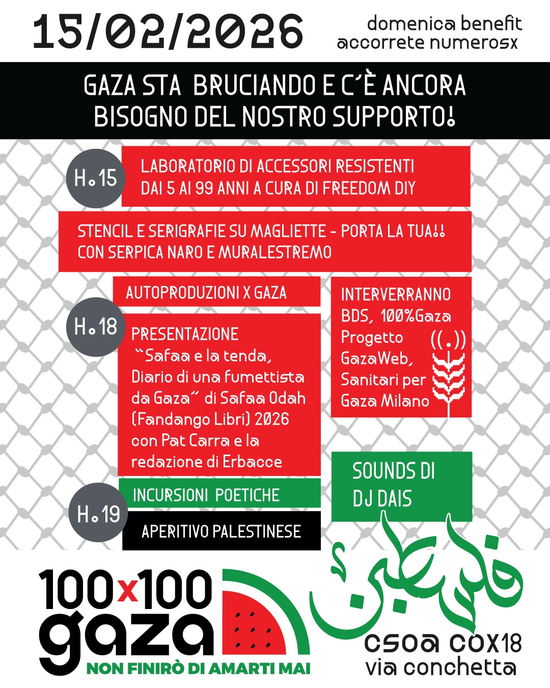 • h. 18:00 Presentazione del libro“Safaa e la tenda, Diario di una fumettista da Gaza” di Safaa Odah (Fandango Libri 2026), con Pat Carra e la redazione di Erbacce.
