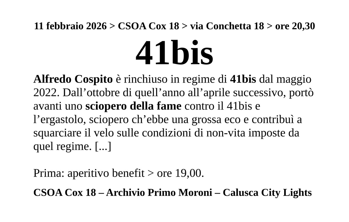 11 febbraio 2026 > CSOA Cox 18 > via Conchetta 18 > ore 20,30
