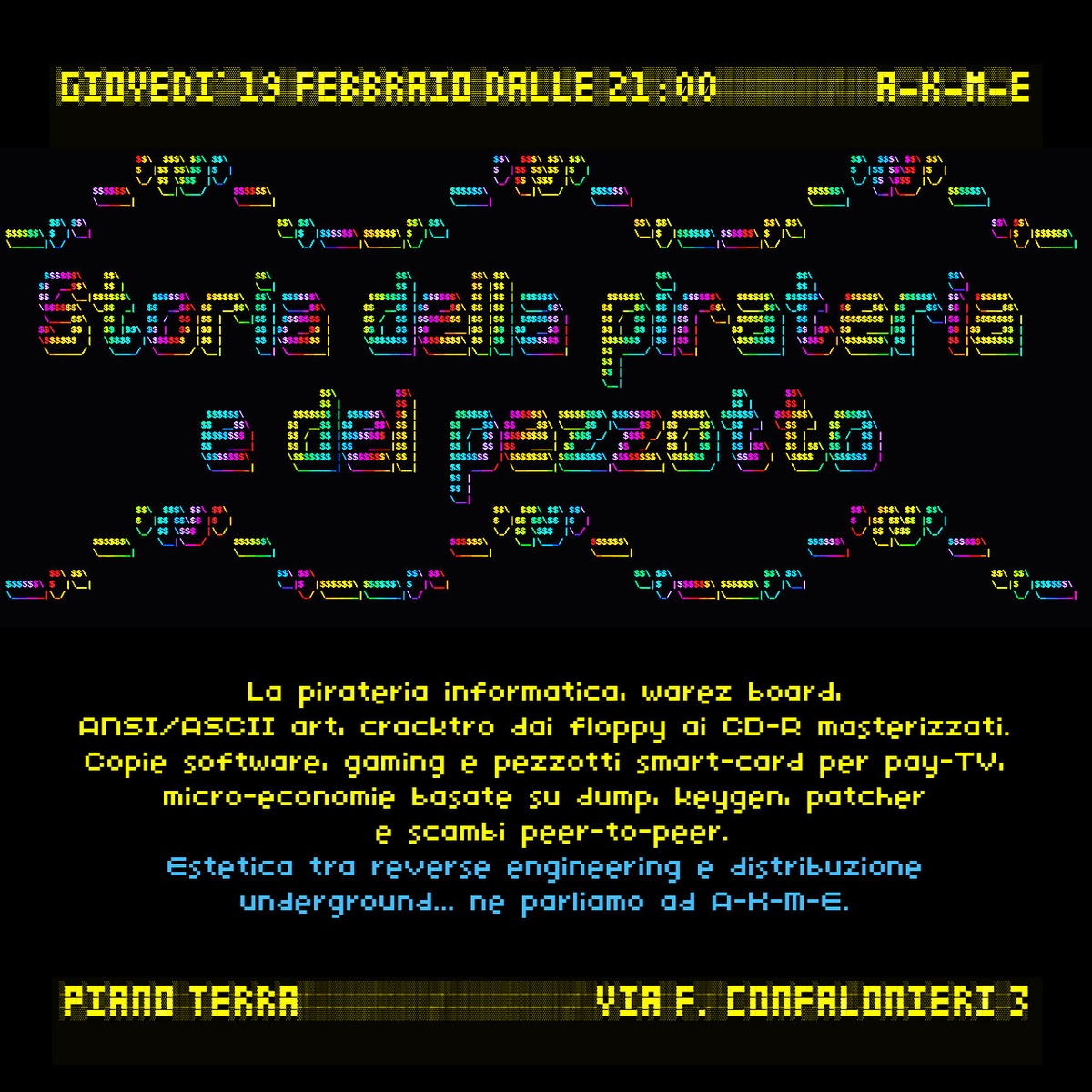 La pirateria informatica, warez board, ANSI/ASCII art, cracktro dai floppy ai CD‑R masterizzati. Copie software, gaming e pezzotti smart‑card per pay‑TV, micro‑economie basate su dump, keygen, patcher e scambi peer‑to‑peer. Estetica tra reverse engineering e distribuzione underground… ne parliamo ad A-K-M-E