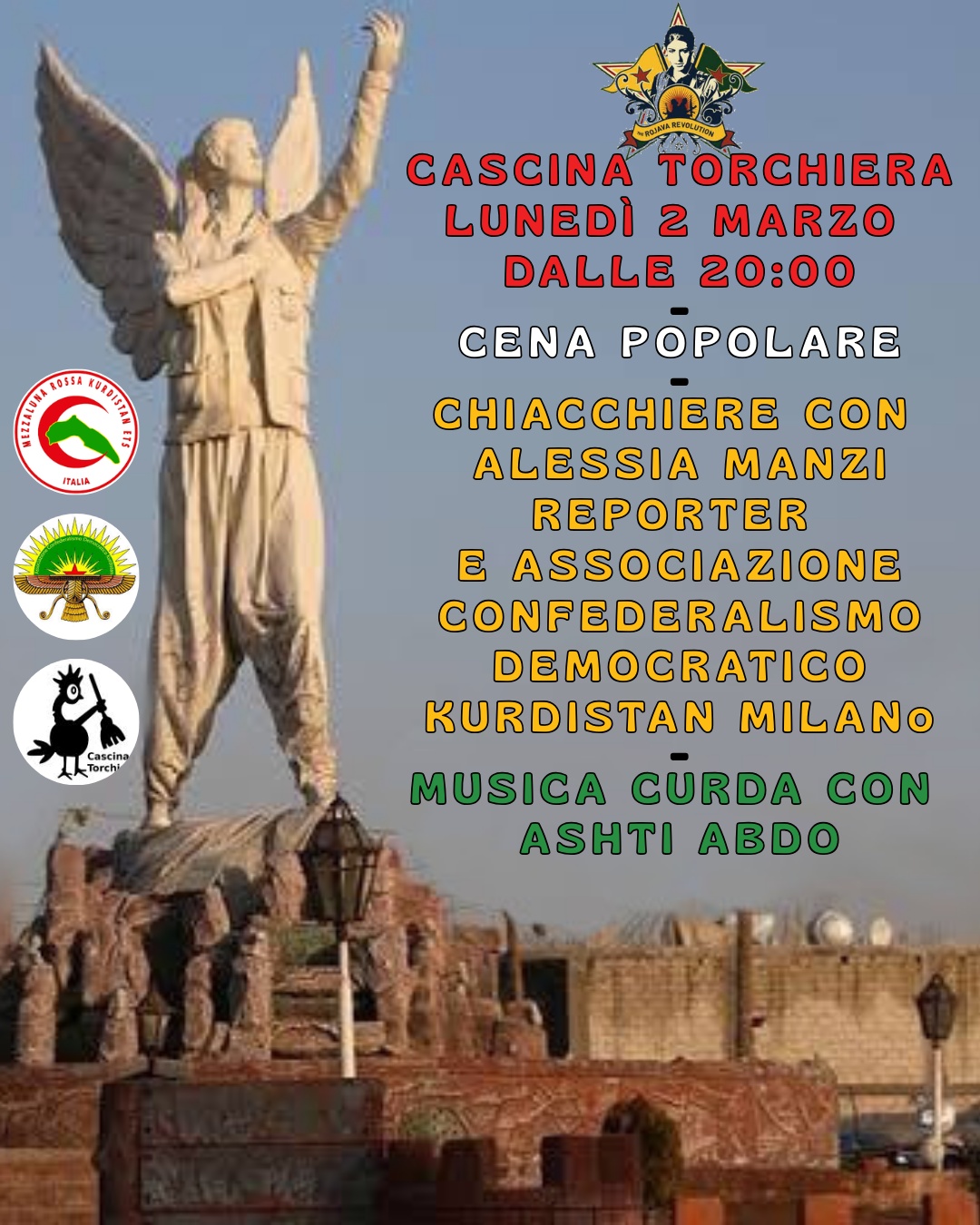 lunedì 2 marzo vi aspettiamo in Cascina Torchiera con la reporter Alessia Manzi che ci aggiornerà rispetto alla situazione Curda, saranno con noi anche Mezzaluna Rossa Kurdistan e L'associazione Confederalismo Democratico Kurdistan Milano.