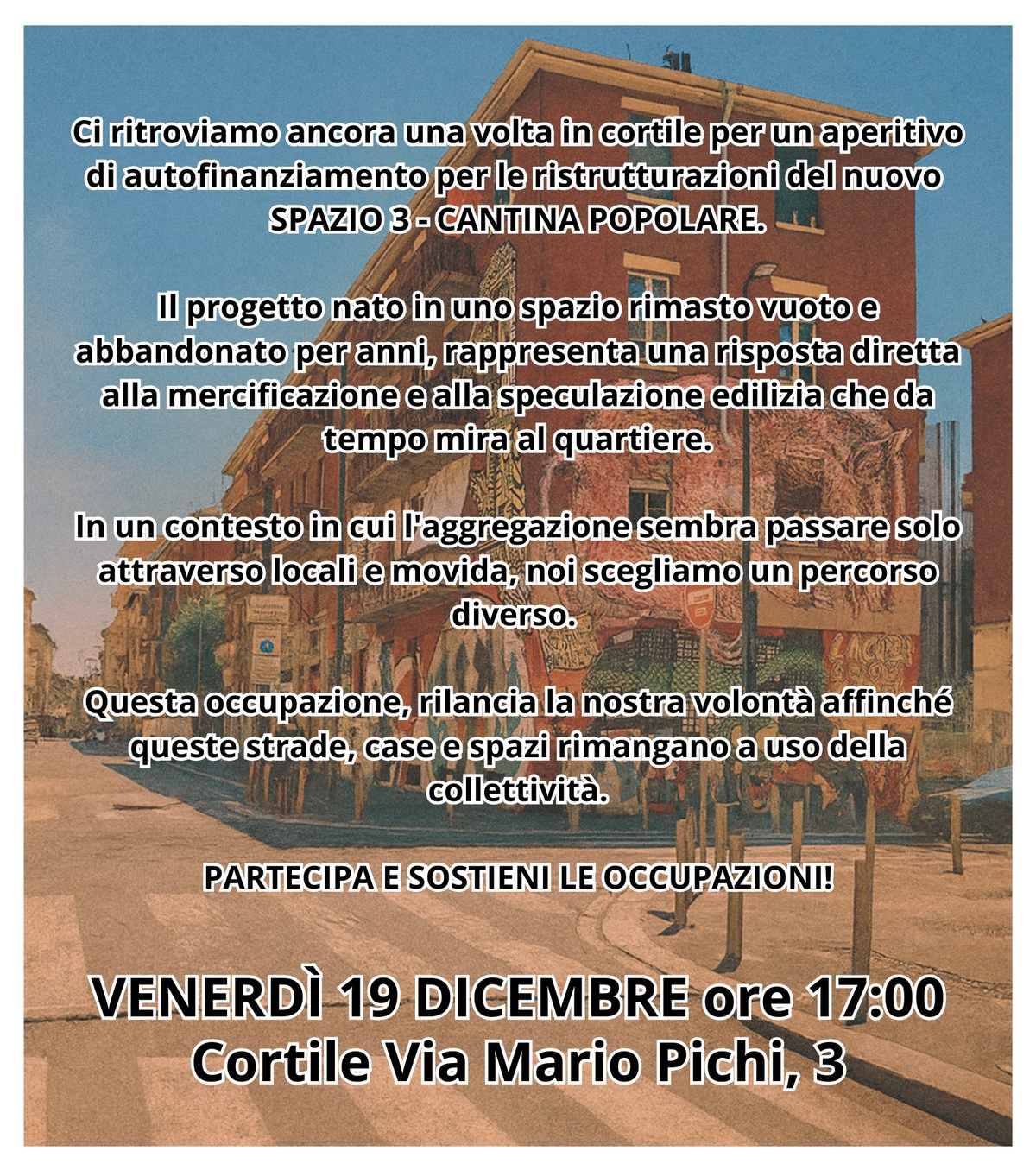 Ci ritroviamo ancora una volta nel cortile di via Pichi 3 per un aperitivo di autofinanziamento per le ristrutturazioni del nuovo SPAZIO 3 - CANTINA POPOLARE.