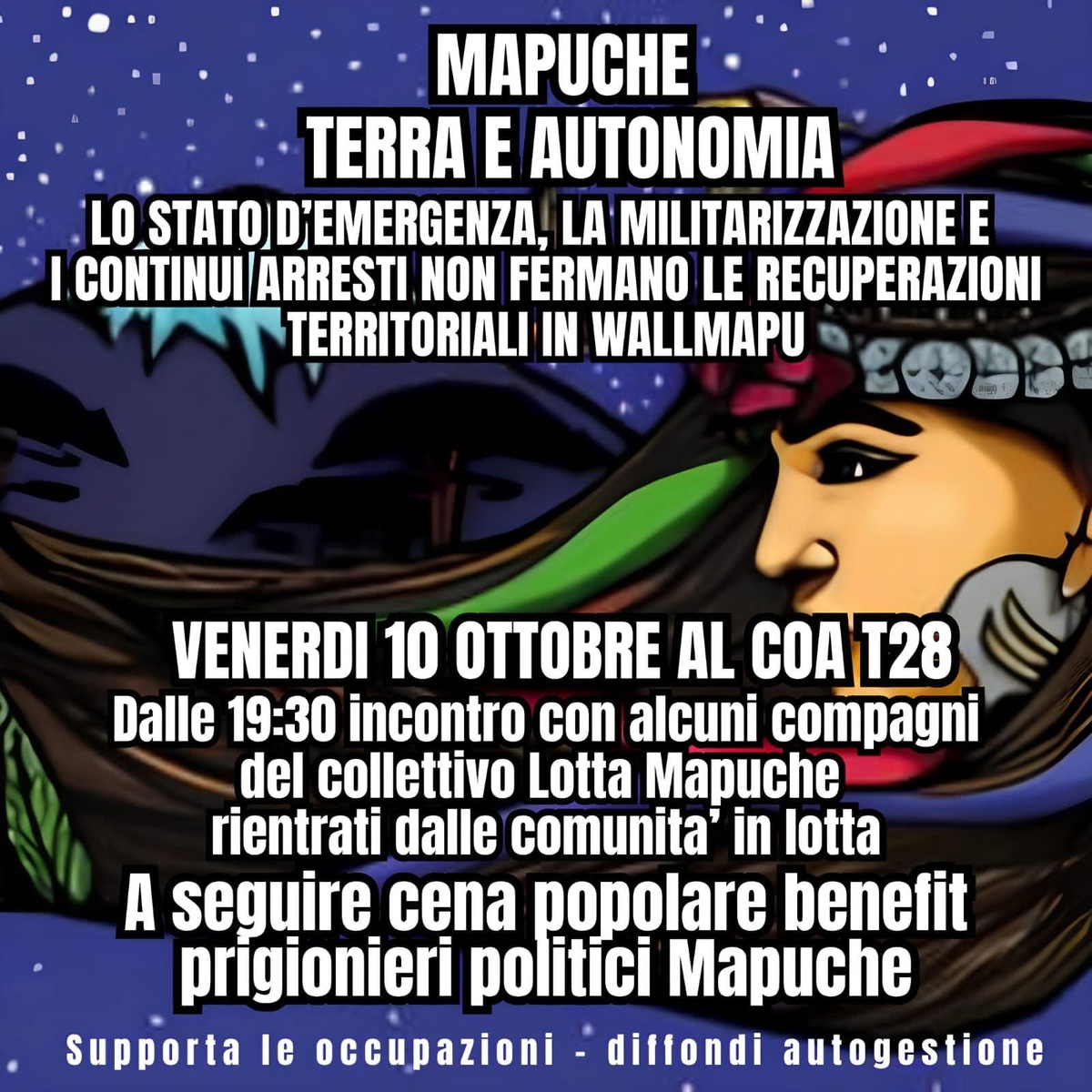 Dalle 19:30 incontro con alcuni compagni recentemente rientrati dalle comunità in lotta e a seguire cena popolare benefit prigionieri politici Mapuche.