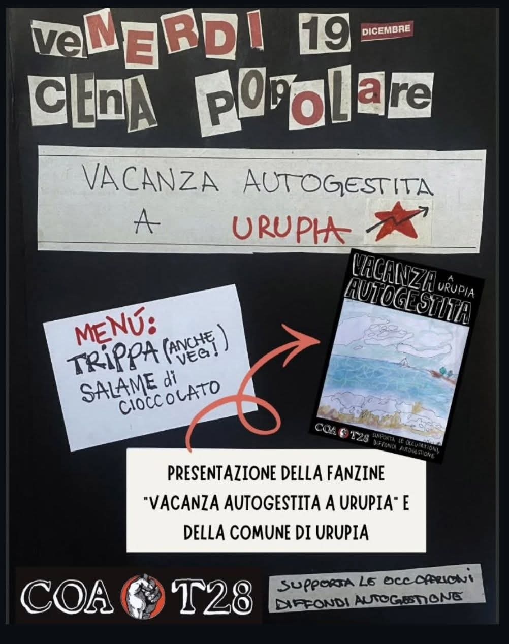 racconto e condivisione delle vacanze autogestite e della fanzine sull'ultima vacanza a Urupia - comune libertaria in Puglia. A seguire cena popolare!