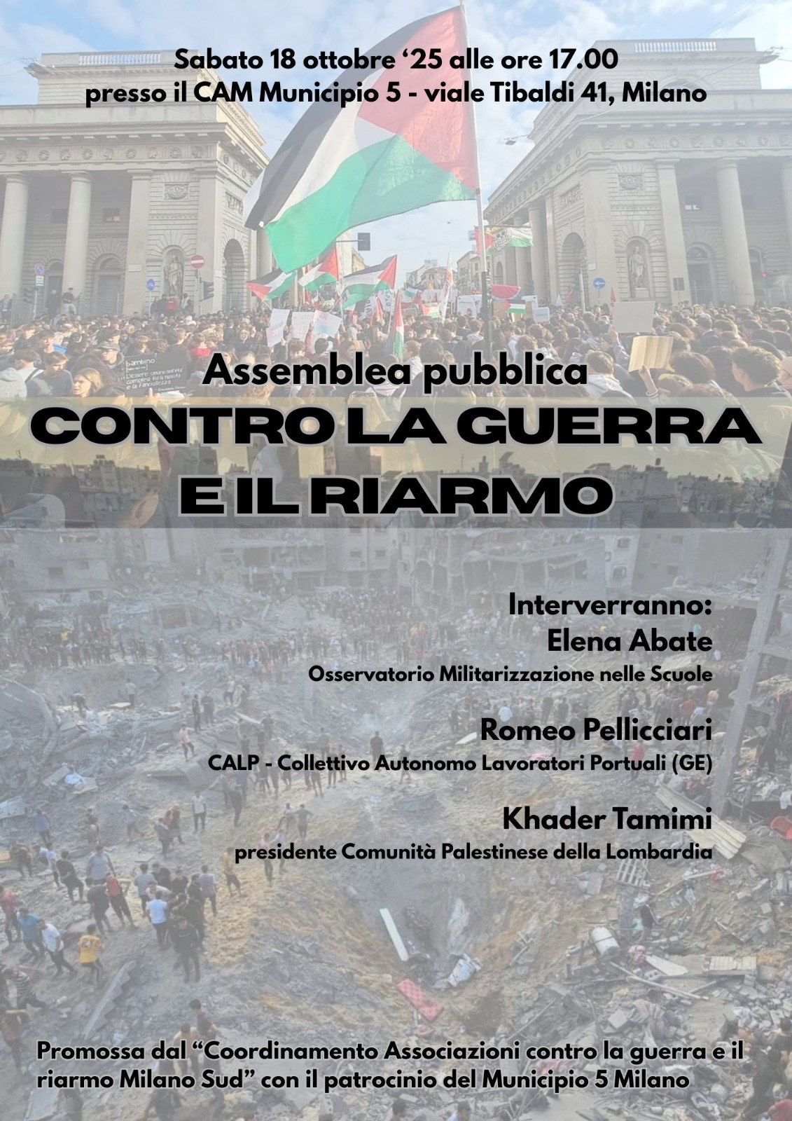 Il Coordinamento Associazioni contro la guerra e il riarmo Milano Sud invita tutti e tutte all'assemblea pubblica al CAM del Municipio 5 in via Tibaldi 41.