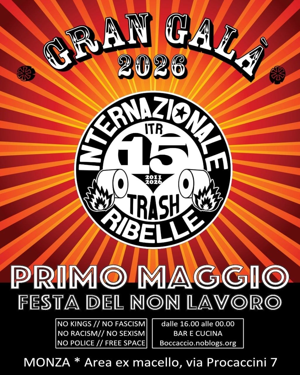 FESTA DEL NON LAVORO con il GRAN GALÀ dell’Internazionale Trash Ribelle CONTRO OGNI RE E REGINA In un tempo di guerra, precarietà, ricatti, stanchezza, mancanza di futuro e mancanza di speranza, noi scegliamo di stare insieme, fare rumore, prenderci lo spazio, trasformare tutto in festa.