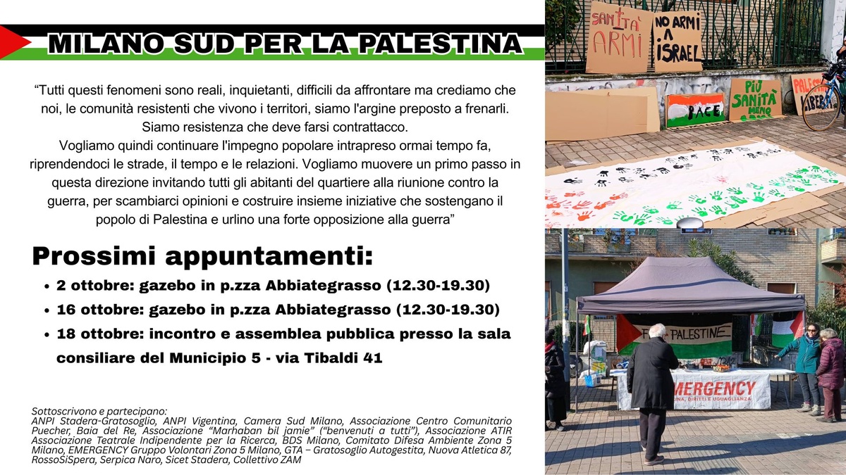 ANPI Stadera-Gratosoglio, ANPI Vigentina, Camera Sud Milano, Associazione Centro Comunitario Puecher, Baia del Re, Associazione “Marhaban bil jamie” (“benvenuti a tutti”), Associazione ATIR Associazione Teatrale Indipendente per la Ricerca, BDS Milano, Comitato Difesa Ambiente Zona 5 Milano, EMERGENCY Gruppo Volontari Zona 5 Milano, GTA – Gratosoglio Autogestita, Nuova Atletica 87, RossoSiSpera, Serpica Naro, Sicet Stadera, Collettivo ZAM