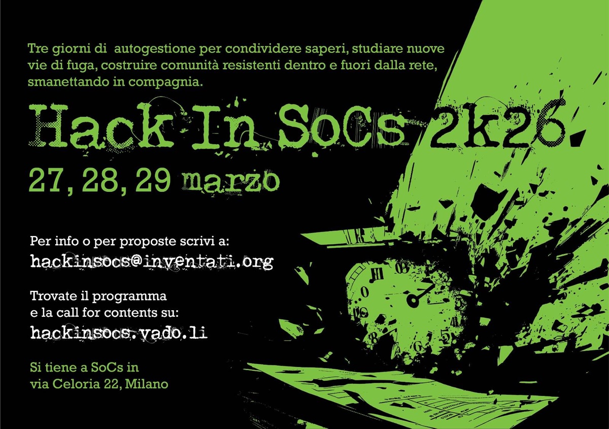 Proponi il tuo talk/lab a hackinsocs@inventati.org. Unici requisiti: l'entusiasmo e un'impostazione orizzontale.