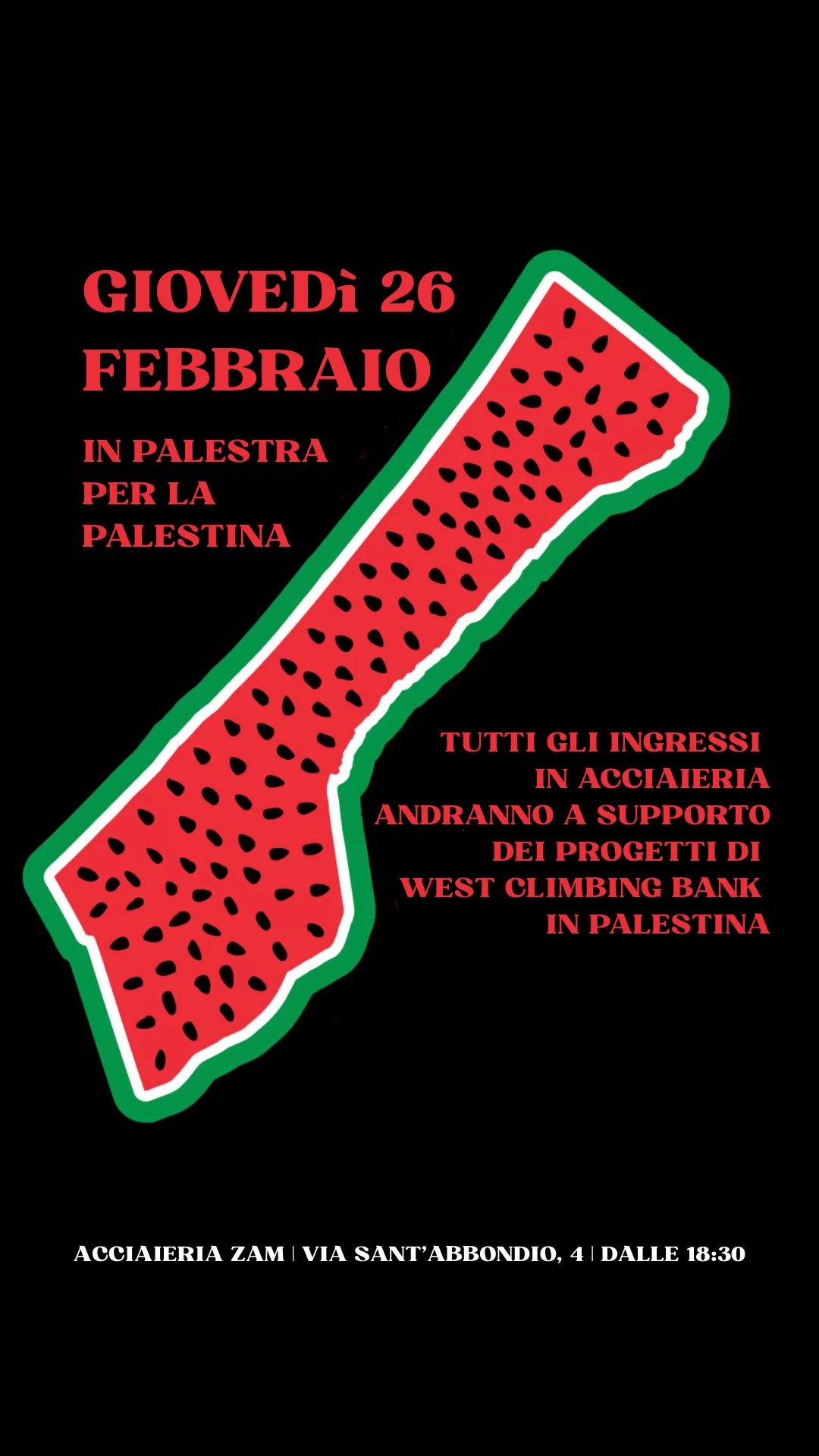 Giovedì 26 febbraio tutti gli ingressi in Acciaieria andranno a supporto della Palestina e di West Climbing Bank, un progetto di arrampicata libera nato proprio tra le mura della nostra palestra.