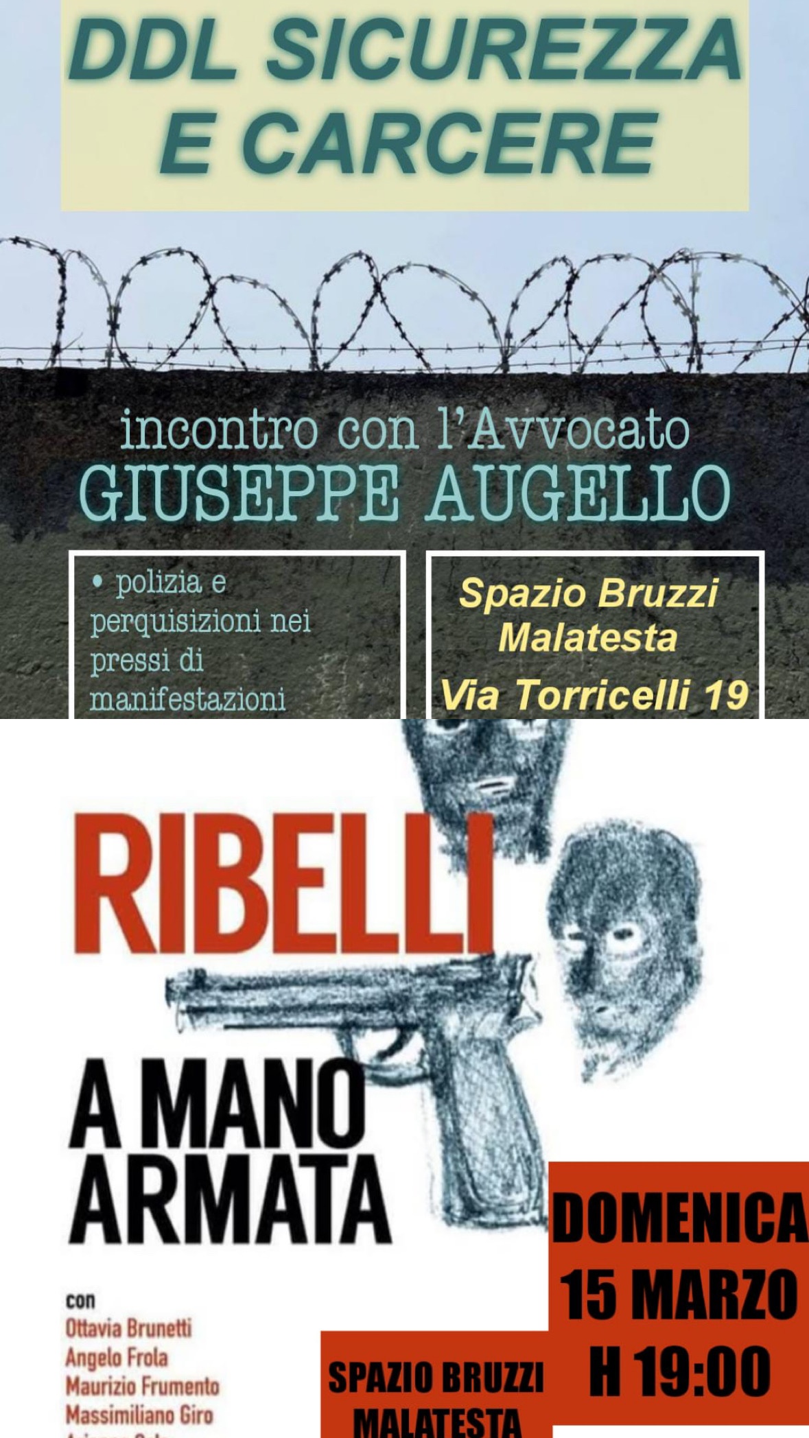 INCONTRO SU DDL SICUREZZA E CARCERE + SPETTACOLO TEATRALE “RIBELLI A MANO ARMATA”