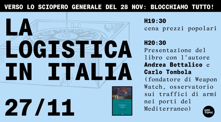 Giovedì 27 novembre presentazione del libro La logistica in Italia. Merci, lavoro e conflitti (Carocci 2025) con l’autore Andrea Bottalico e Carlo Tombola (fondatore di Weapon Watch, osservatorio sui traffici di armi nei porti del Mediterraneo).
