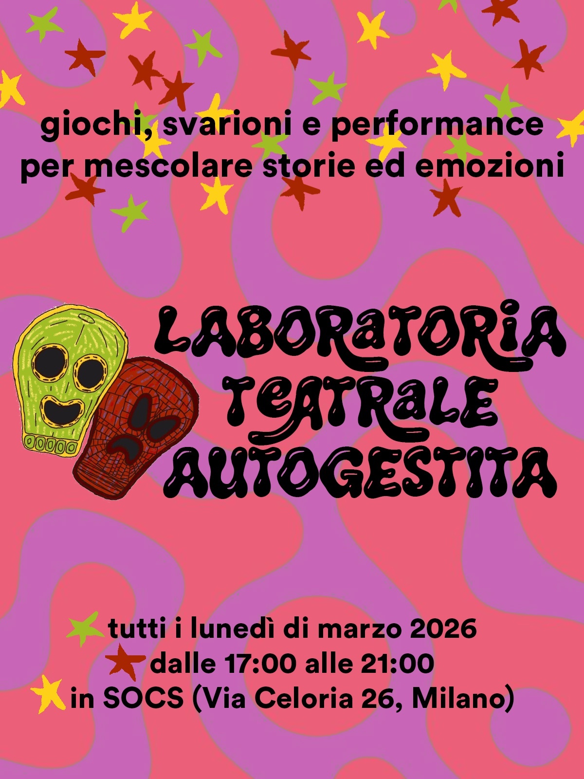 Se stai cercando uno spazio dove andare in scena, che tu sia alle prime armi o una veterana del palcoscenico, questa laboratoria fa al caso tuo! Esploreremo insieme spazi, emozioni e movimenti, in maniera autogestita, gratuita e non giudicante, per imparare e divertirci tutte insieme💛