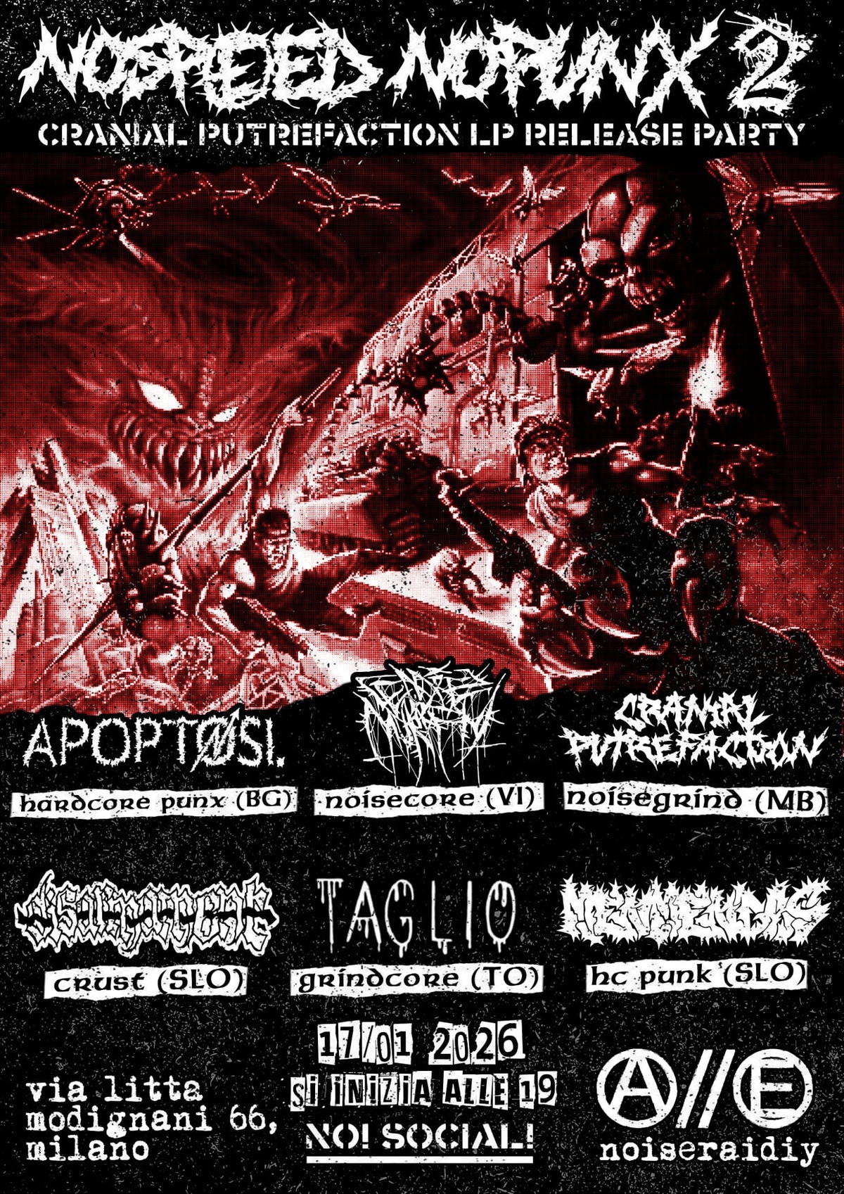 In occasione dell'uscita del primo disco dei Cranial Putrefaction, "Occhio Per Occhio", abbiamo dato vita alla seconda edizione del No Speed No Punx fest, evento totalmente D.I.Y.