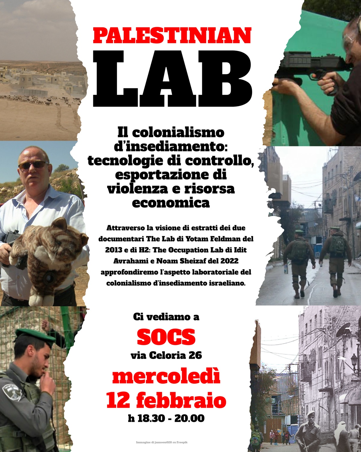Approfondiremo l’aspetto laboratoriale del colonialismo d’insediamento israeliano attraverso la visione di estratti dei due documentari The Lab (di Yotam Feldman, 2013) e di H2: The Occupation Lab (di Idit Avrahami e Noam Sheizaf, 2022).