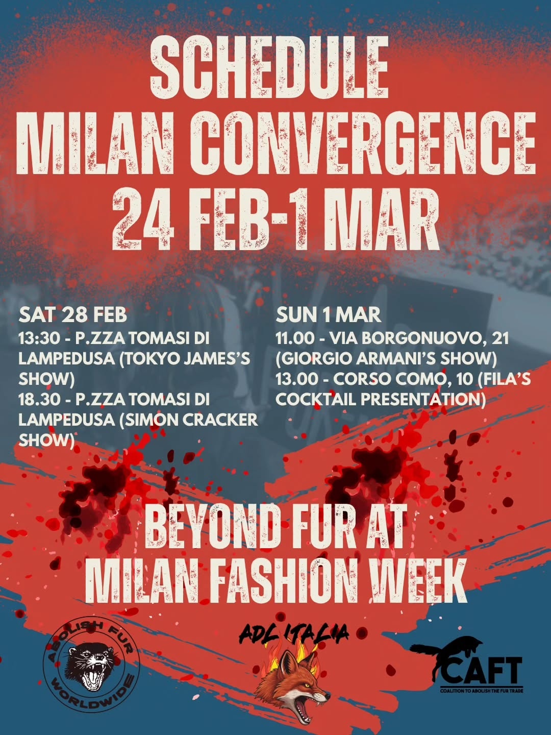 Si tratta della quinta protesta dall'inizio della Fashion Week, iniziata il 24 febbraio. L3 attivist3 affermano che le proteste quotidiane continueranno fino a domenica 1 marzo nell'ambito di una campagna globale lanciata da abolishfur.org (CAFT).