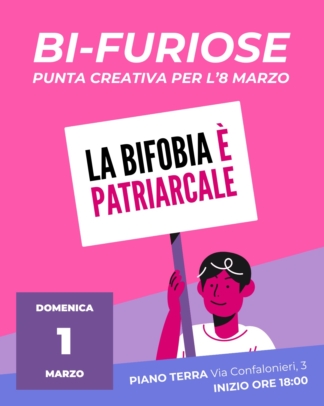 Ci vediamo per realizzare insieme cartelli bisessuali e mezzelune di fuoco per prepararci assieme per il corteo dell'8 marzo, per dare visibilità e voce alle persone bisessuali.