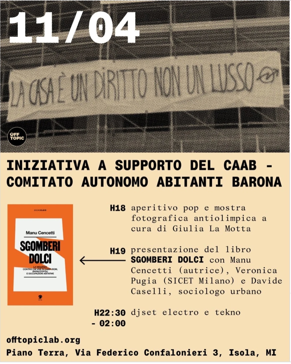 Partendo dal libro Sgomberi Dolci, vi invitiamo sabato 11 aprile a un momento di confronto libero sul diritto alla casa e alla città.: