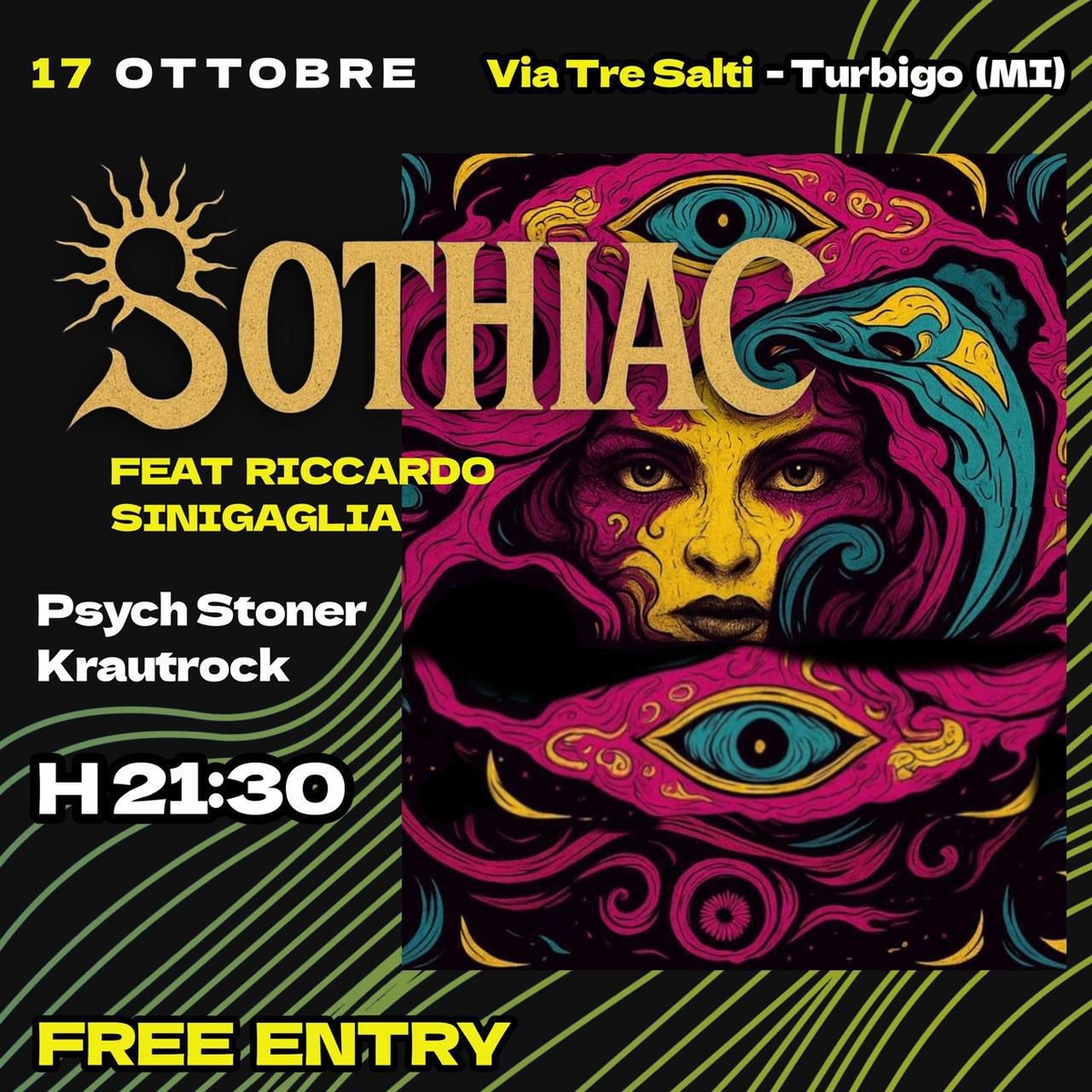 Un rituale sonoro che fonde psych-stoner, krautrock con l’avanguardia elettronica di Riccardo Sinigaglia – architetto, docente storico di musica elettronica al Conservatorio di Milano e figura chiave del progetto Futuro Antico e dell’audiovisivo Correnti Magnetiche.